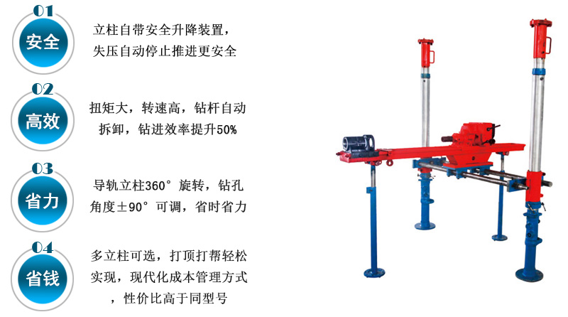 1、不用移動立柱即可完成水平面2-3米的平行工作面多排打孔。