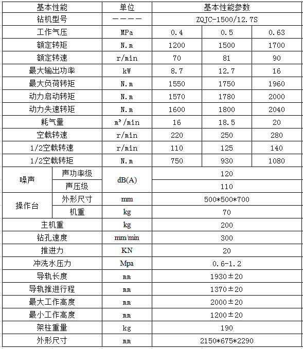 用途:ZQJC-1500/12.7S氣動架柱式鉆機主要是以壓縮空氣為動力,主要使用高效螺旋鉆桿和硬質合金鉆頭回轉鉆進的動力頭式鉆機。該鉆機為便攜式,由回轉動力裝置、導軌、雙立柱和操作臺組成。它具有安全防爆、轉矩大、轉速高、質量輕、體積小、效率高、結構簡單、維修方便等特點。適用于探測地質構造煤層、探放水、抽放瓦斯、煤體注水、卸放壓力孔、巷道貫通超前孔、巷道錨桿支護孔及其他特殊用途。該機工作效率高、進尺費用少、成孔質量高、工人操作勞動強度低,是煤礦行業必備設備之一。