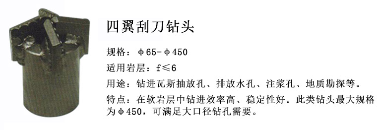 金剛石復合片四翼鉆頭穩定性好、適應性強、使用壽命長、鉆進中鉆整體巖 層效率高、保徑效果好、適用范圍和具有優越的性價比等特點,可廣泛應用于地質勘探、 煤礦開采、水利水電施工、公路鐵路施工建設的巖石鉆進,鉆進瓦斯抽放孔、排放水孔、注漿孔、地質 勘探等。