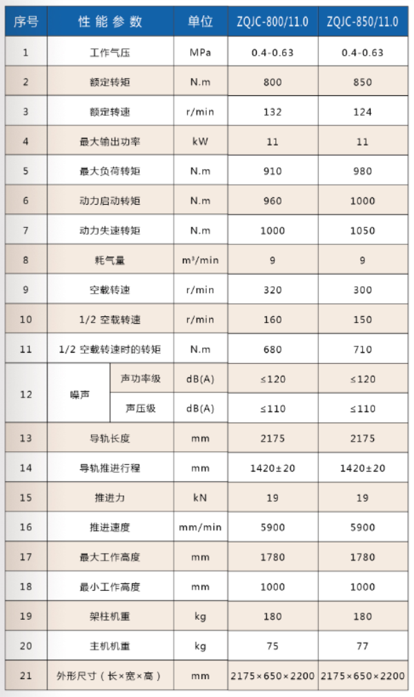 ZQJC800系列氣動架柱式鉆機產品簡介 類別:氣動架柱式鉆機 型號:ZQJC-850/11.0S,ZQJC-800/11.0S, 品牌:河北啟睿 用途:ZQJC-800/11.0S型氣動架柱式鉆機主要用于煤礦煤層探水、探排瓦斯 孔或地質結構孔的施工。該鉆機轉速更高,扭矩更大,功率更強、并可正反轉、 大大提高了人機工作效率,是煤礦行業常用鉆具之一。